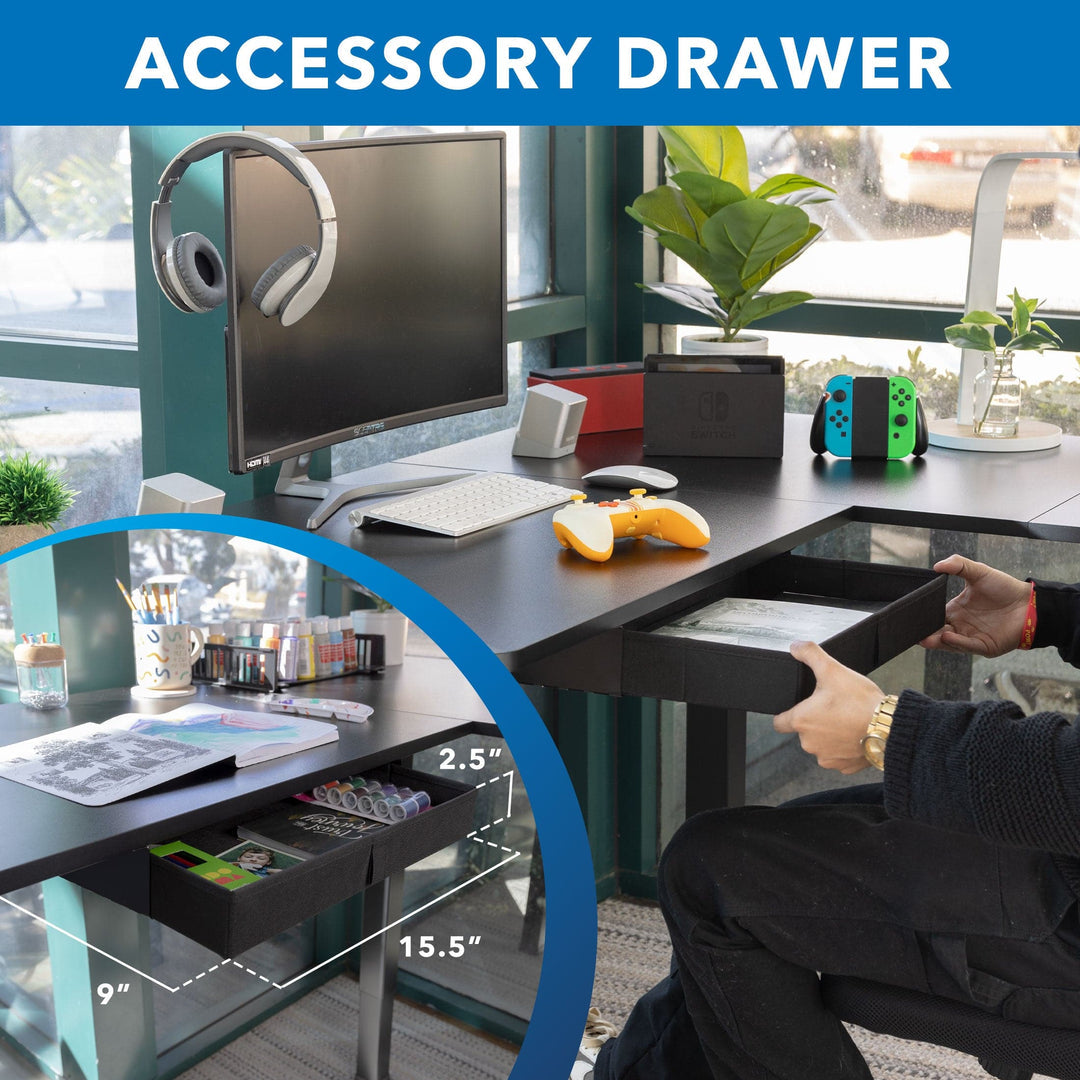 Add movement to your working day without compromising on valuable desk space with this large height adjustable corner desk. Switch between sitting and standing at the simple push of a button. The advanced digital control panel comes with three memory settings for your preferred sitting and standing heights. The integrated anti-collision function ensures that your desk does not bump into objects such as filing cabinets when it is lowered. To help you stay organized, the corner desk features a cloth drawer, two hooks for bags or headphones and cable management for neat cable routing. Two motors ensure smooth and quiet height adjustment between 28.3 and 46.5 inches. To provide you with utmost flexibility when it comes to choosing the best space for your corner desk, the longer desktop piece can be installed on either the left or the right side.
