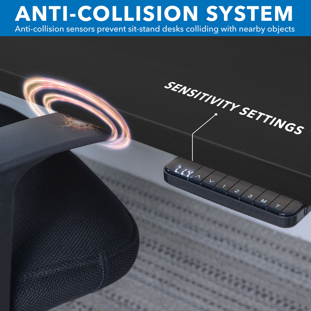 Shop the ultimate solution for an ergonomic and dynamic workspace! This premium electric height adjustable sit-stand desk with 55" wide tabletop comes with two powerful motors, double crossbars and 3-stage telescoping legs to ensure best-in-class stability even at the highest setting and reliable height adjustment the first time, every time. All you need to do is push the button on the easy-to-use control panel to switch between sitting and standing. To eliminate the guesswork, the keypad even offers memory settings for your preferred heights as well as a timer function to remind you when it's time to stand up. This electric sit stand desk accommodates a large variety of users with its extensive height adjustment range between 25.4" and 51.4". For your peace of mind, the integrated anti-collision safety feature detects objects in the moving path and stops the motor automatically. An integrated cable management system ensures a clutter-free workspace at home or in the office.